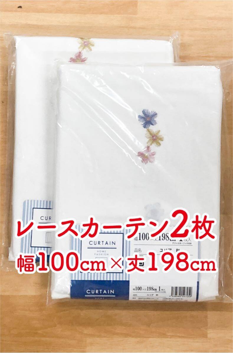> 9-1)新品!レースカーテン2枚 幅100cm×丈198cm 花の刺繍付き