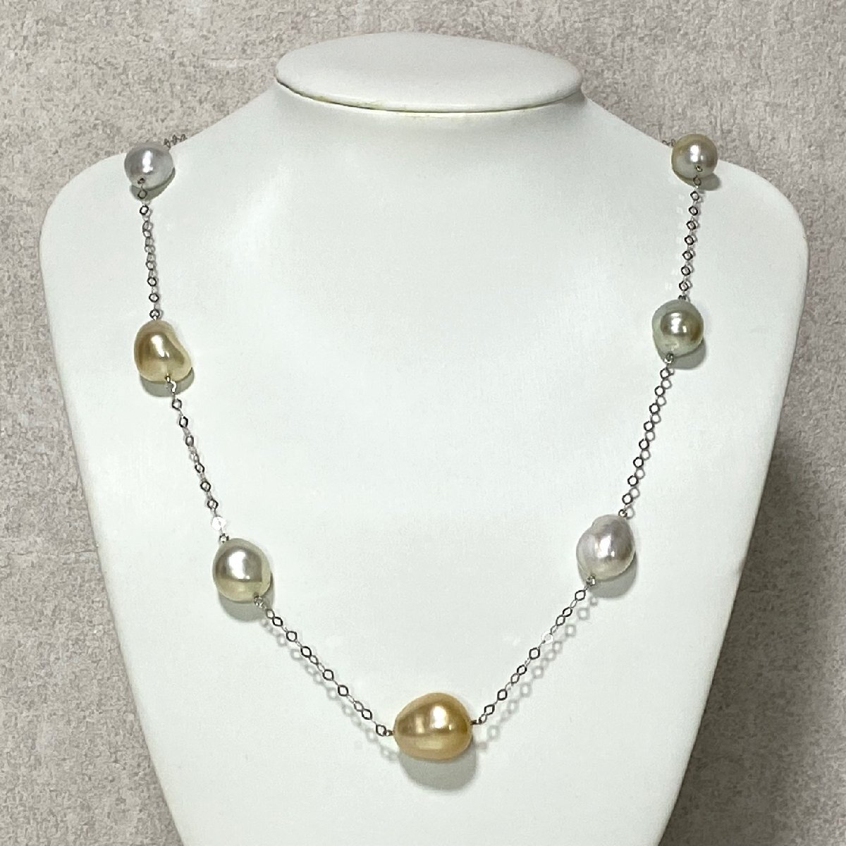> ☆【KJC】 長さ約56㎝ 南洋(白蝶)真珠 セミラウンド パール ステーションネックレス K18WG サイズ約10.7ー約14.5mmくらい