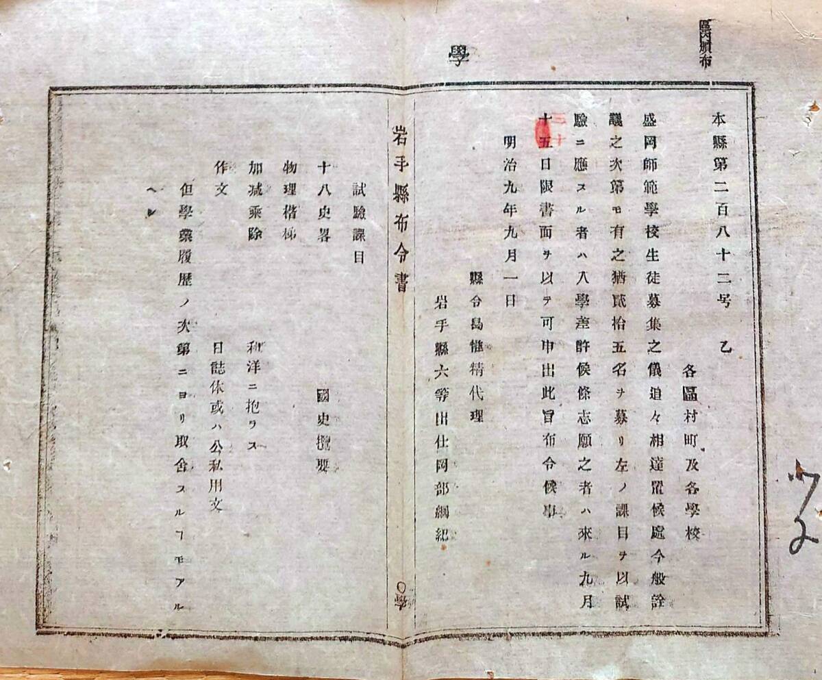 - f24052507〇明治布告布達 盛岡師範学校生徒募集 試験科目 岩手県布令書 明治9年〇和本古書古文書