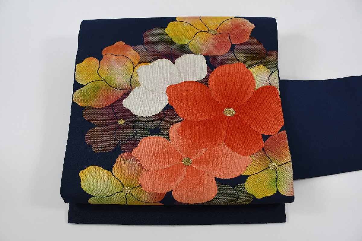 - 名古屋帯 花 秋草 紺 帯丈354cm ★着物屋 ne-10117 桜庭呉服店