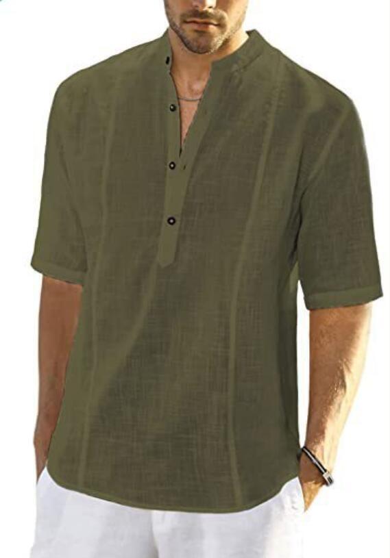 - S-3XLサイズ選択 / 半袖シャツ メンズ 5分袖 綿麻シャツ 麻シャツ コットンシャツ 開襟 カジュアルシャツ 涼しい 通気性 夏物 / グリーン