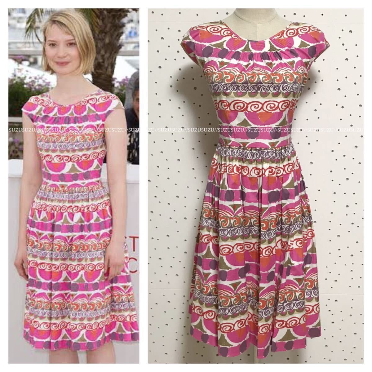 > 本物 名作 プラダ アートデザイン フレンチスリーブ ワンピース ドレス 36S ピンク系マルチカラー フレア ギャザー PRADA レターパック可