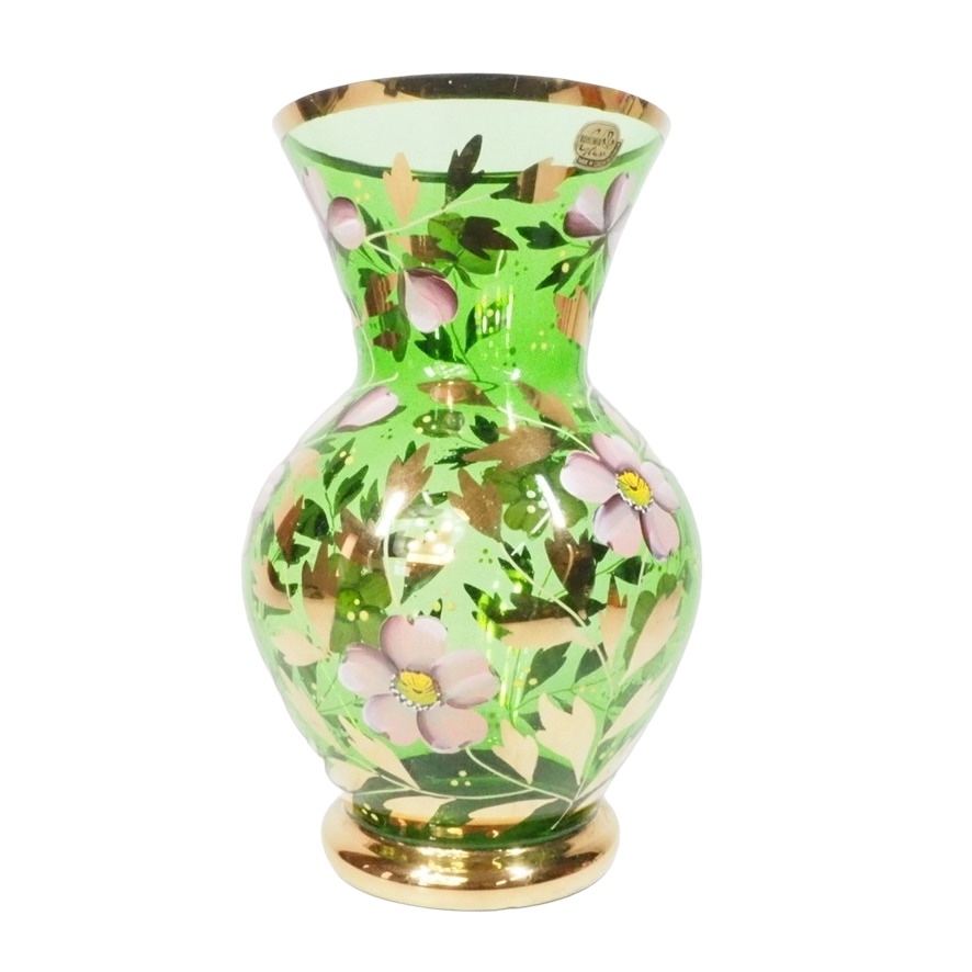 - 海外ビンテージ チェコ製 ボヘミアガラス ハンドペイント 金彩 花柄ガラス花瓶 花瓶 ガラス 1980年代 SMG606