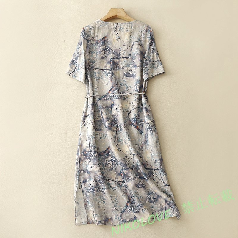 - 新品カジュアル レトロ ゆったりサイズ 古風絵図案 ベルト Vネック 半袖 ミドル丈ワンピース 杏 LE459