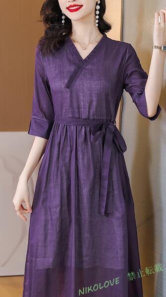- 新品ワンピース レディース ロングワンピース 綿麻 半袖 体型カバー ゆるシルエット 無地 きれいめ M-2XL LE581