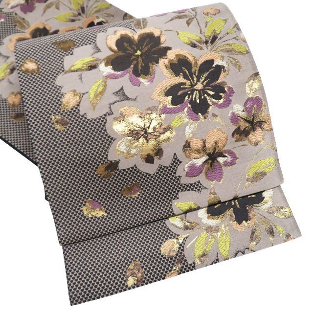 > 袋帯 中古 リサイクル 正絹 フォーマル 仕立て上がり 六通 花の図 桜 黒茶色 多色 金 きもの北條 A1036-13