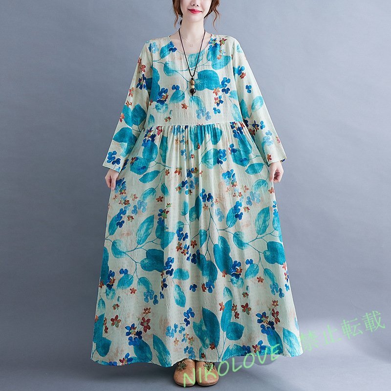 - 新品大きいサイズゆったり カジュアル 体型カバー ロングワンピース プリント柄 綿麻 20304050代 長袖 大きいサイズ LD222