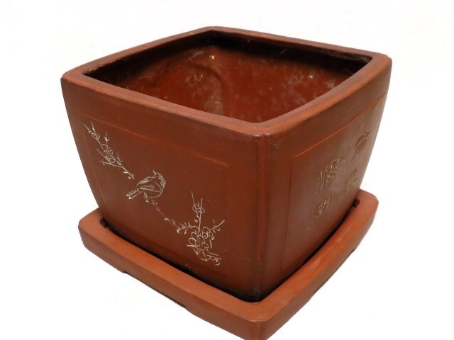 - 中国鉢 釘彫 朱泥鉢 角印 落款 皿付 植木鉢 盆栽鉢
