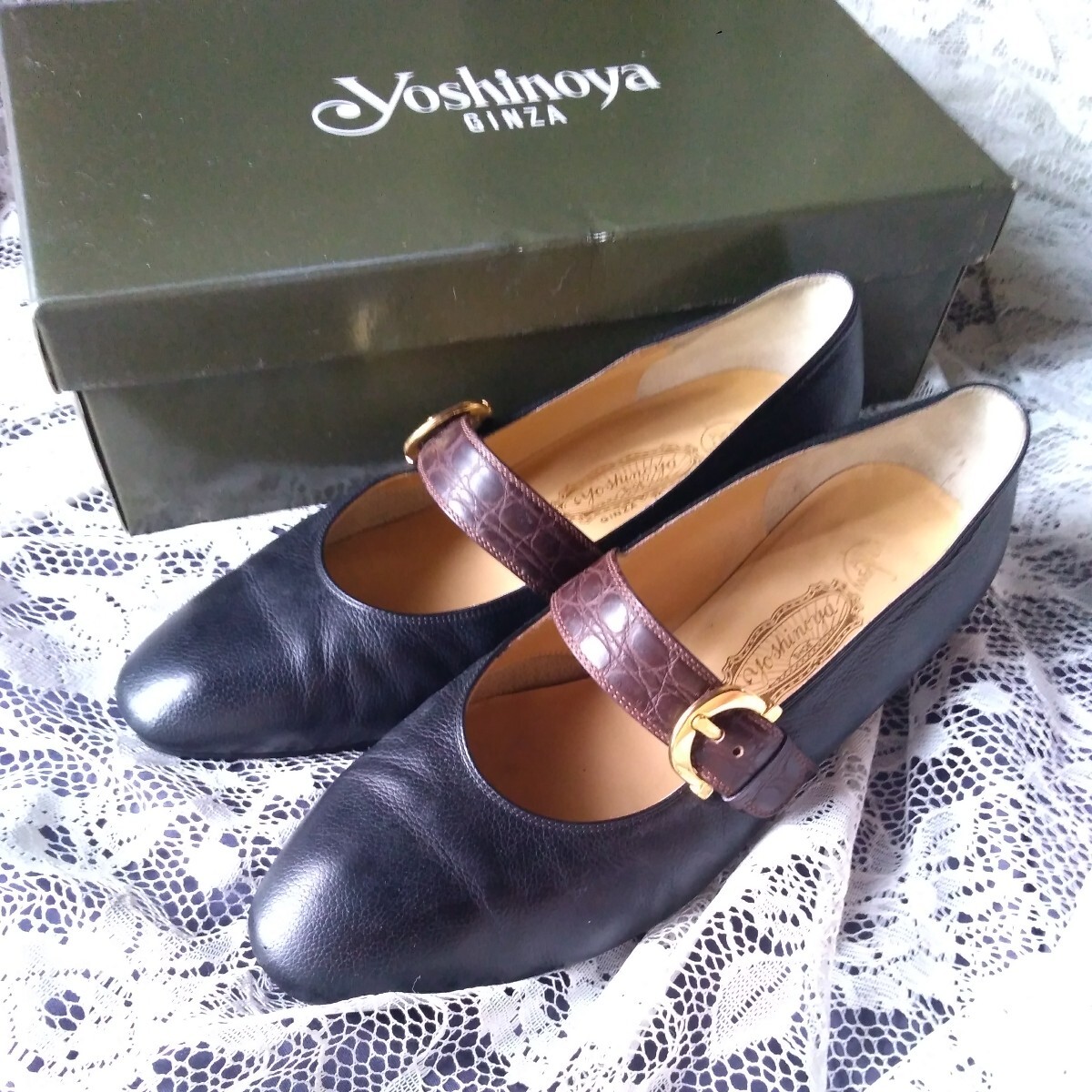 - 綺麗め 銀座よしのや パンプス 本皮 黒系 オールウェザー 22サイズ 激安
