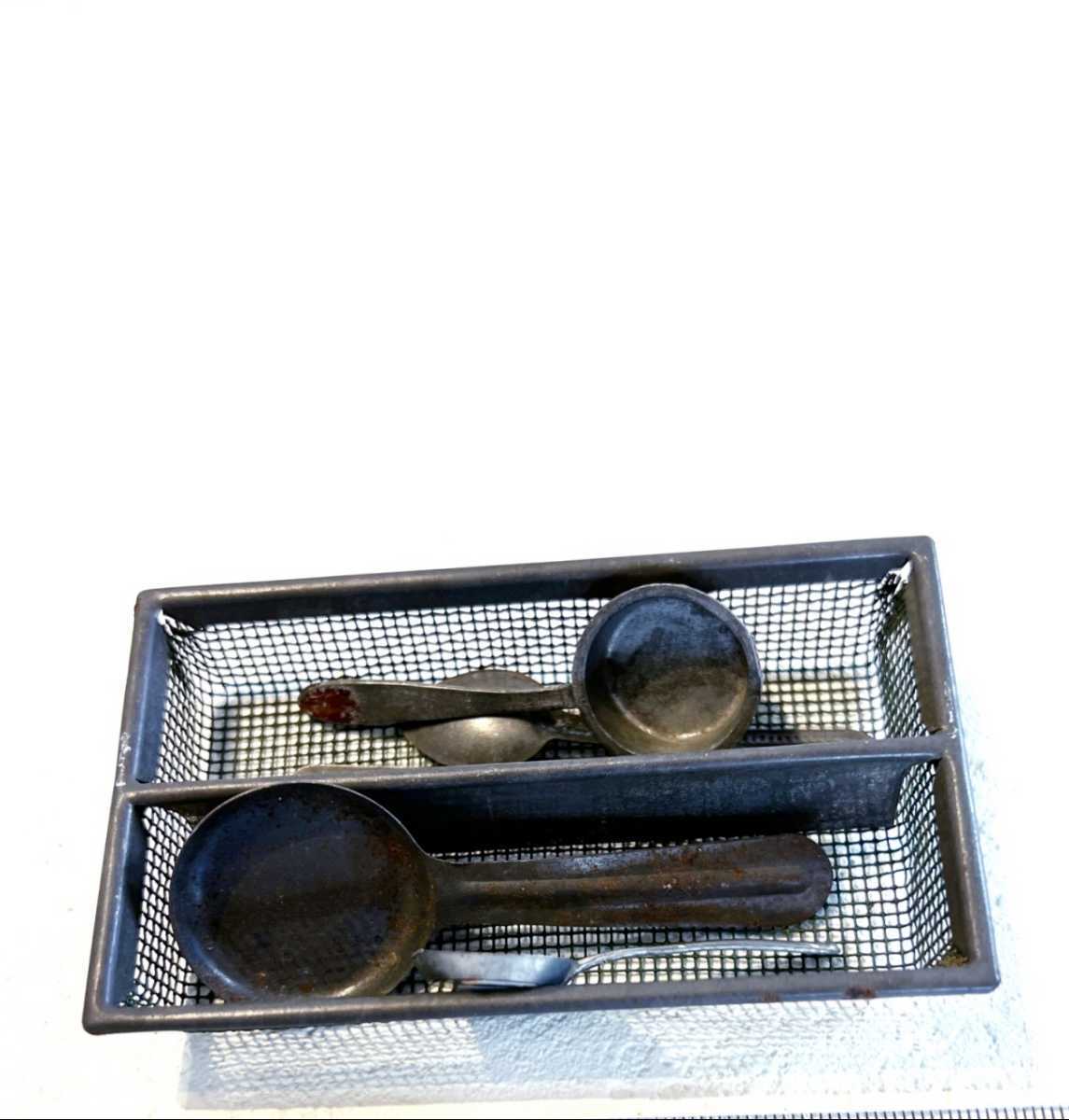 - 【雑貨・ミニチュア】ミニチュアのキッチングッズ6パーツ ジオラマ おもちゃ あみカゴはアイアン製 古いものです 骨董品 アンティーク