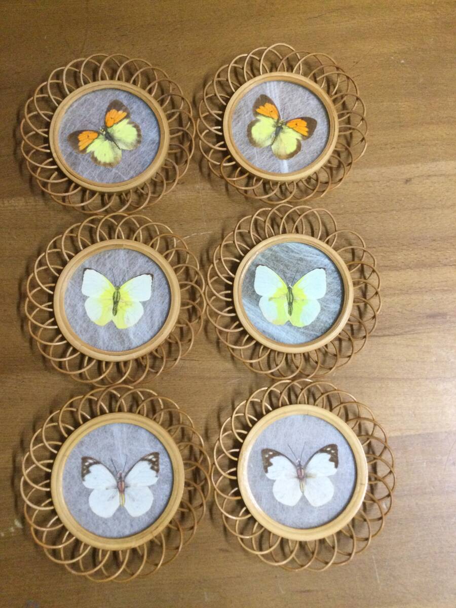 - オブジェ 茶托 3種6客 チョウ標本 竹細工 壁飾りにも 古物保管品 希少