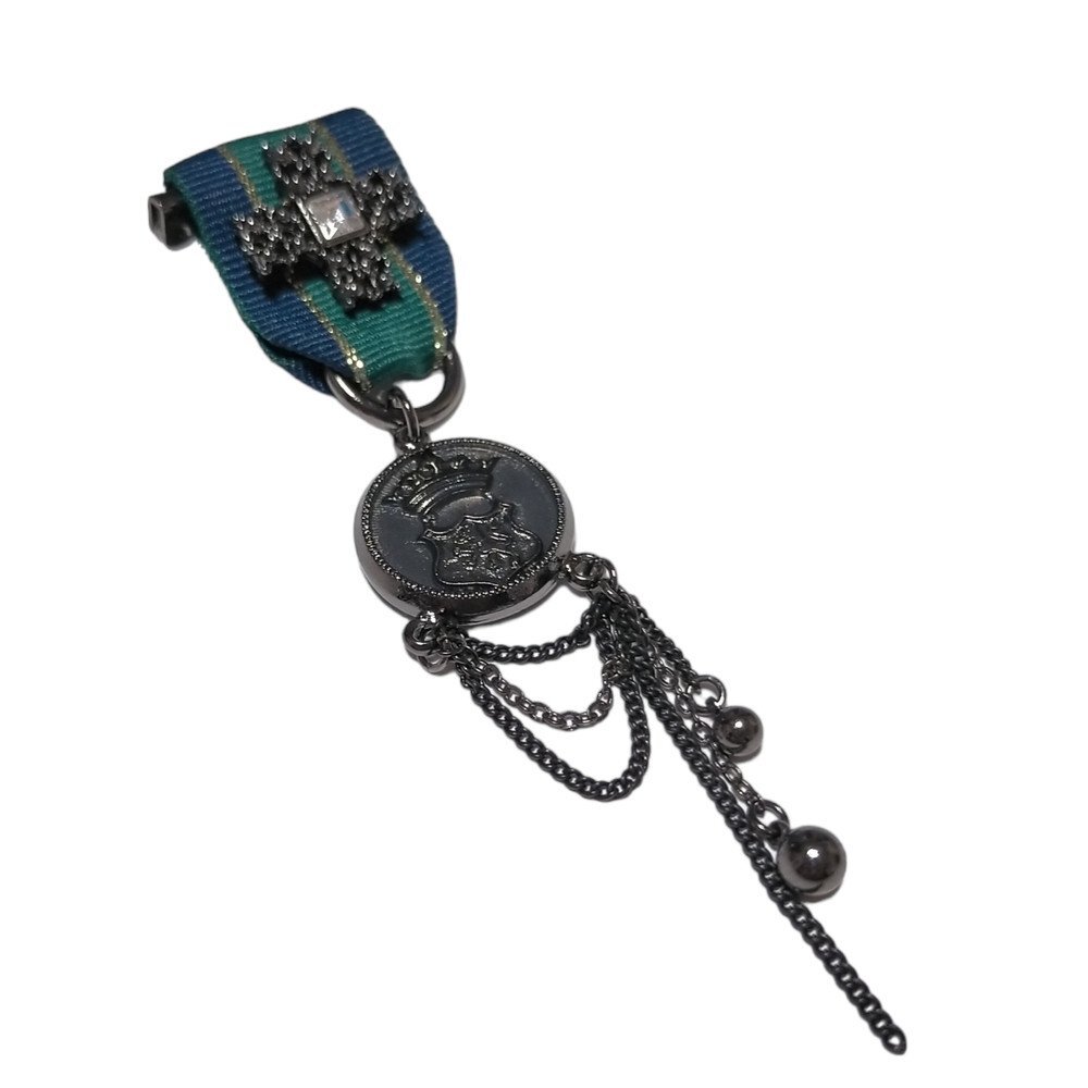 - 新品正規70%OFF COMME CA MEN コムサメン 日本製 ラペルピン 黒 スワロフスキー メダルリボンチェーン ロゴ入り袋付き 6 3056 st