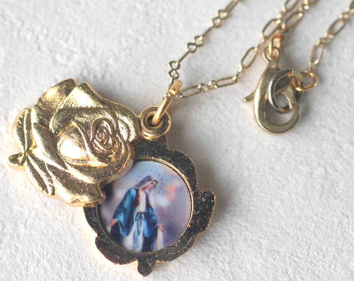 - キリスト教 聖母マリア 薔薇のロケット お守り どこにいても私をお守りください アンティーク調 ヴィンテージ ネックレス