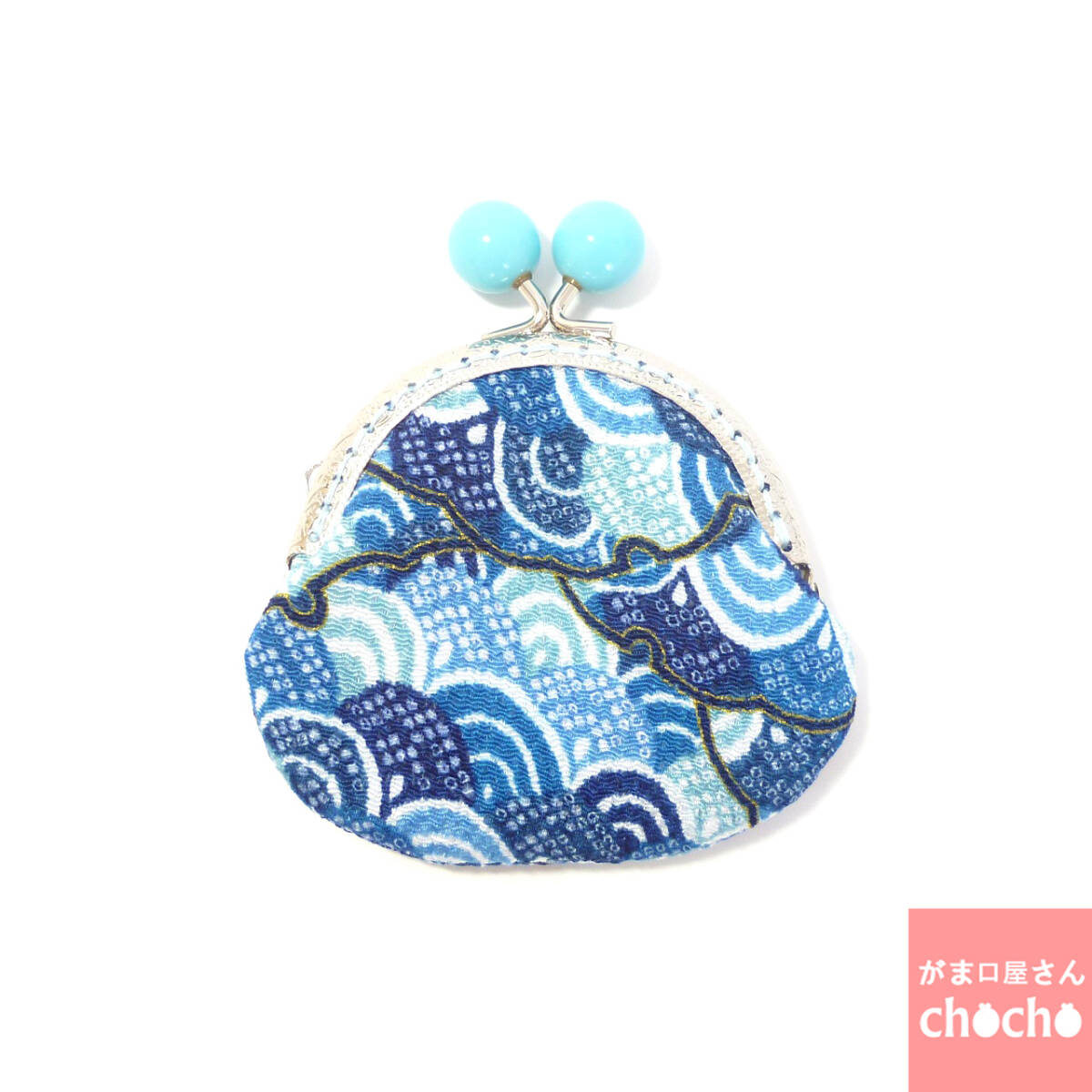 - ちりめん生地のがま口小銭入れ 和柄 青海波 青・ブルーあめ玉 ハンドメイド G207
