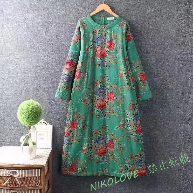 - 新品人気品 レディース 花柄 ワンピース チュニック プリント花柄 秋冬綿麻 中綿暖かい グリーン LC056