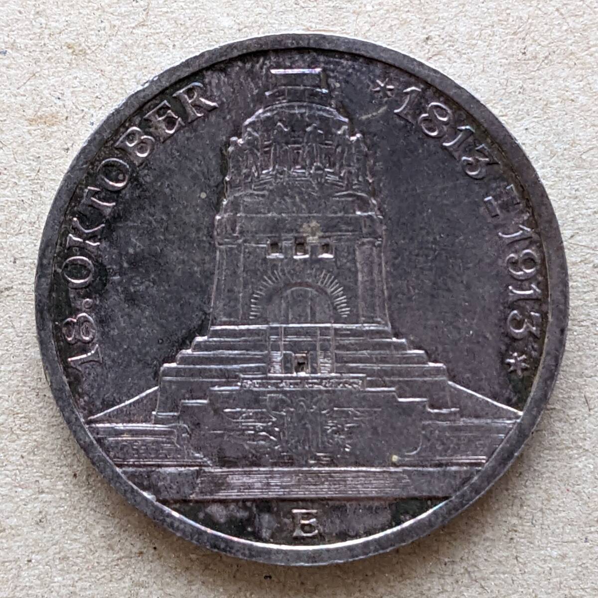 > 1913年 ドイツ ザクセン フリードリッヒアウグスト3世 ライプチヒの戦い100周年記念 3マルク 銀貨 EF ムルデンヒュッテンミント