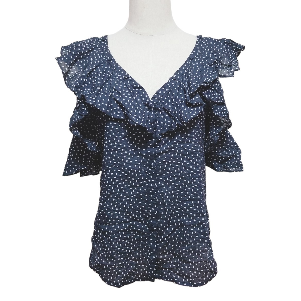 - 送料無料★Y1602 Estella.K エステラケー ビッグフリルカラー シアーブラウス トップス 薄手 半袖 レディース F ネイビー ドット柄 総柄