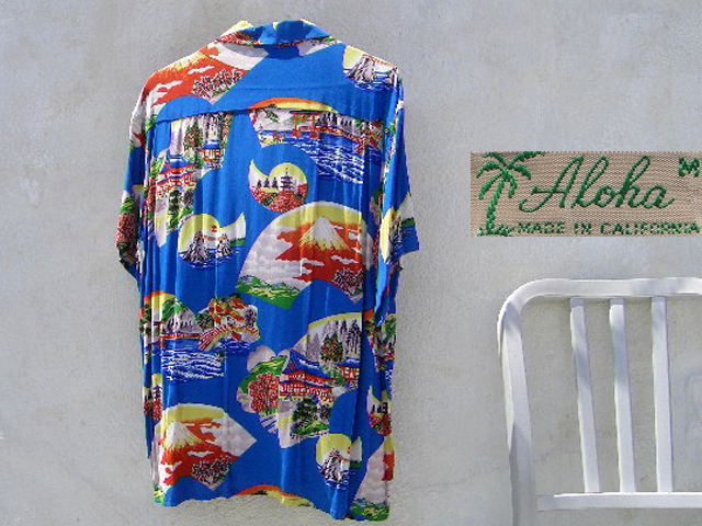 > †90S VINTAGE ALOHA MADE IN CALIFORUNIA USA HAWAII 和柄 夕焼け 夕日 五重塔 富士山 東照宮 椰子 釦 美しきアロハシャッ♪入手困難 美品