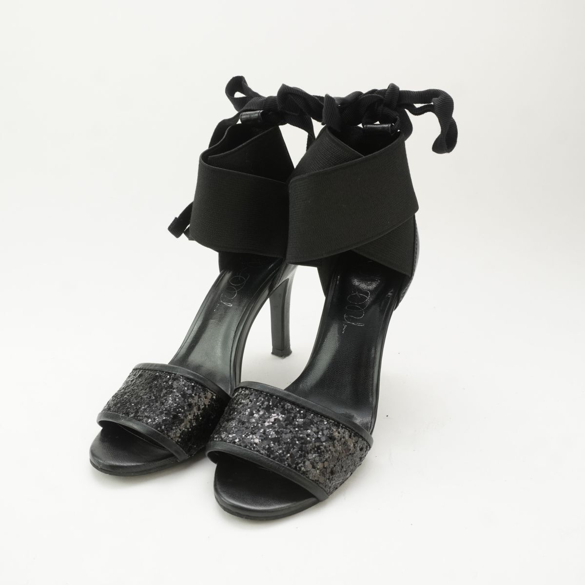 - サンダル 36 23.0 ヒール ラメ かかとリボン レザー 黒 ブラック 箱付き/RC83