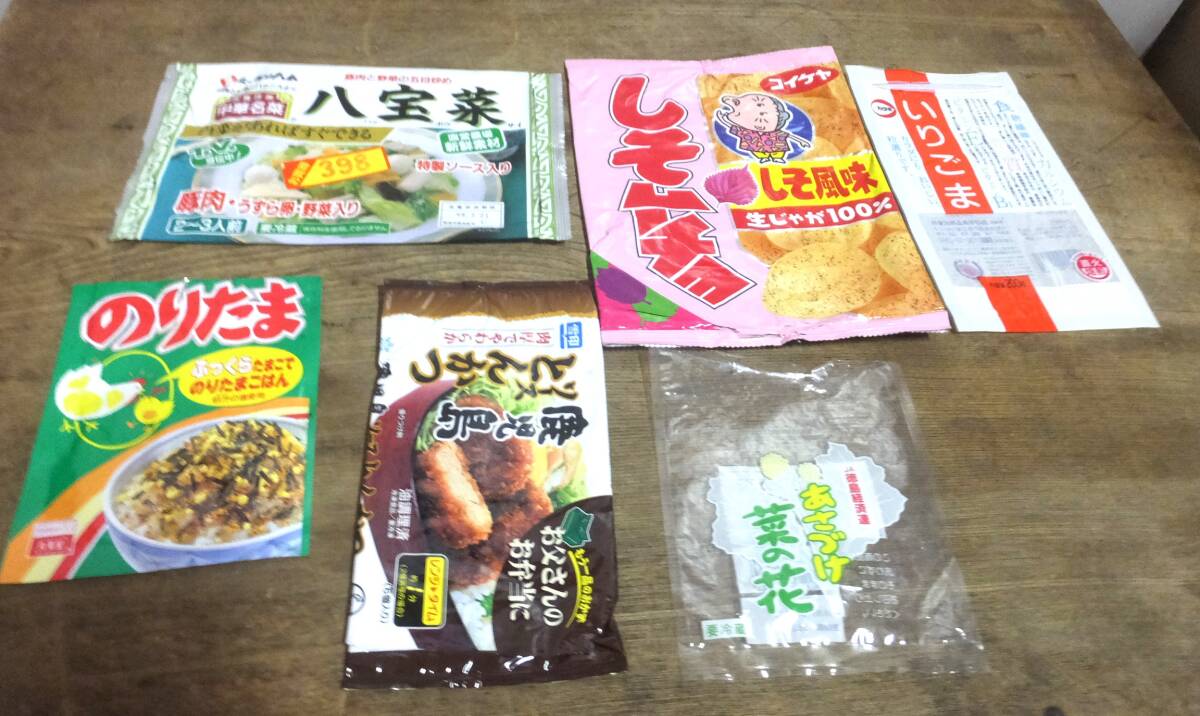 - ▲て-946① 空き袋 6点 1998年頃 のりたま/とんかつ/あさづけ菜の花/八宝菜/しそムーチョ/いりごま 保管品 最大の物 縦26cm横20cm