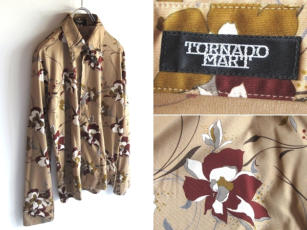 > 希少 TORNADO MART トルネードマート 総柄 花柄 フラワー柄 ストレッチポリエステル シャツ ベージュ Y2K 00s ネオビンテージ ネコポス対応