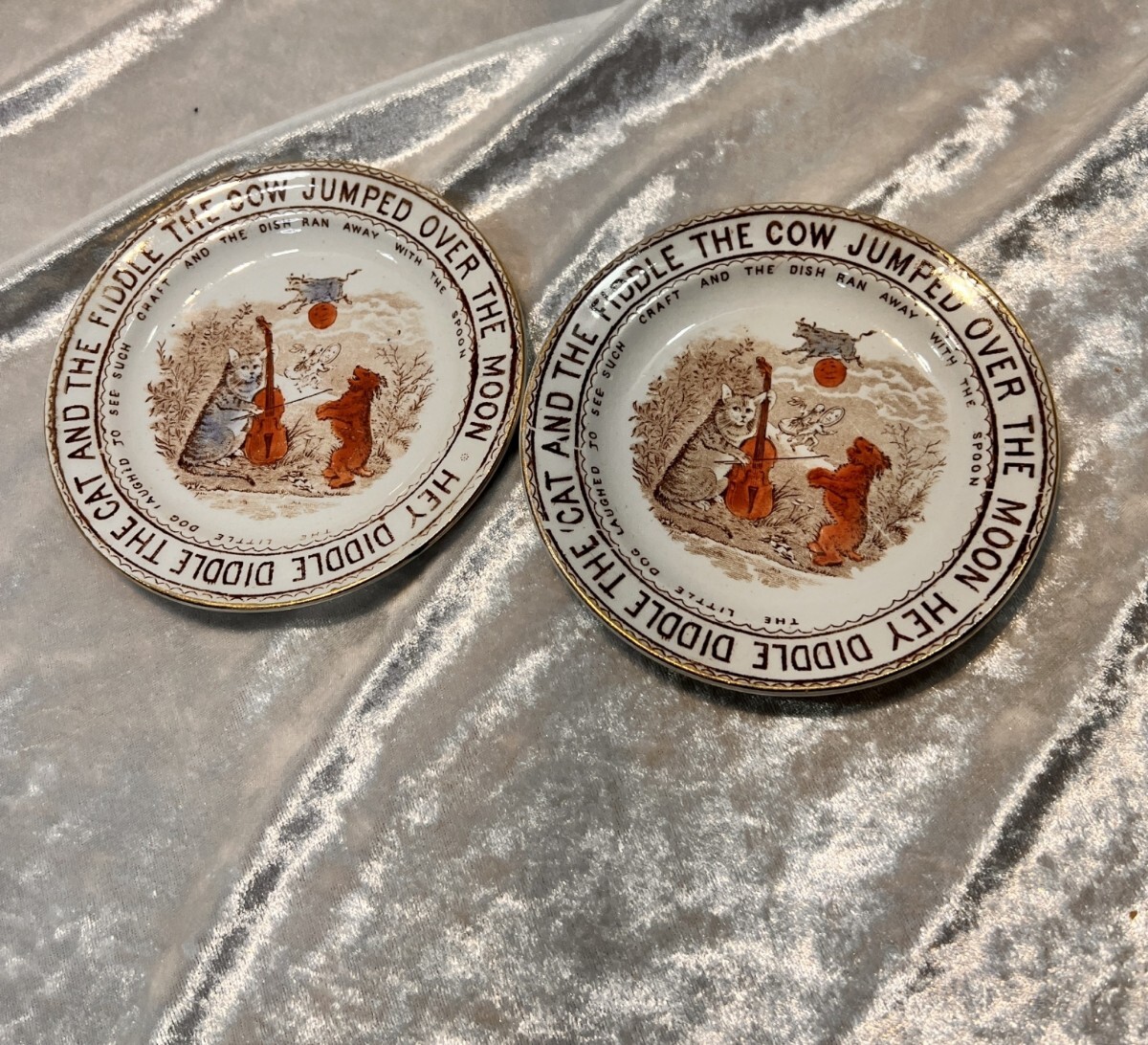- 【陶磁器】マザーグースの小皿2枚セット『Hey didle didle~』イギリスの昔の童謡のデザイン 刻印あり インテリア 骨董品 アンティーク