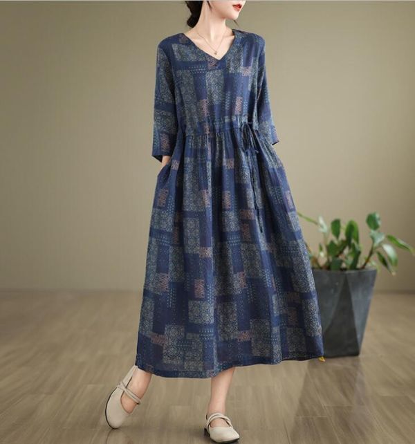 - 新品* ワンピース プリント柄 半袖 ロングワンピース カジュアル 大きいサイズ 着痩せ ゆったり 涼しい Vネック ワンピース*ネイビー