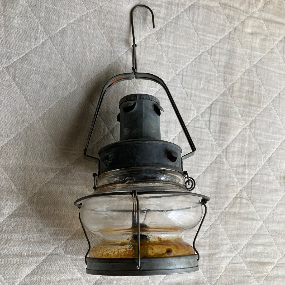 - 大正.昭和時代初期のレトロな釣りオイルランプ.ランタン .紅燈 .照明 .オイルが入って居ます.ビィンテ-ジ.重さ.約300g.横幅.約11.5cm です.
