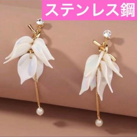 - 結 オーロラ ホワイト フラワー 揺れる フェイクパール ピアス ステンレス鋼