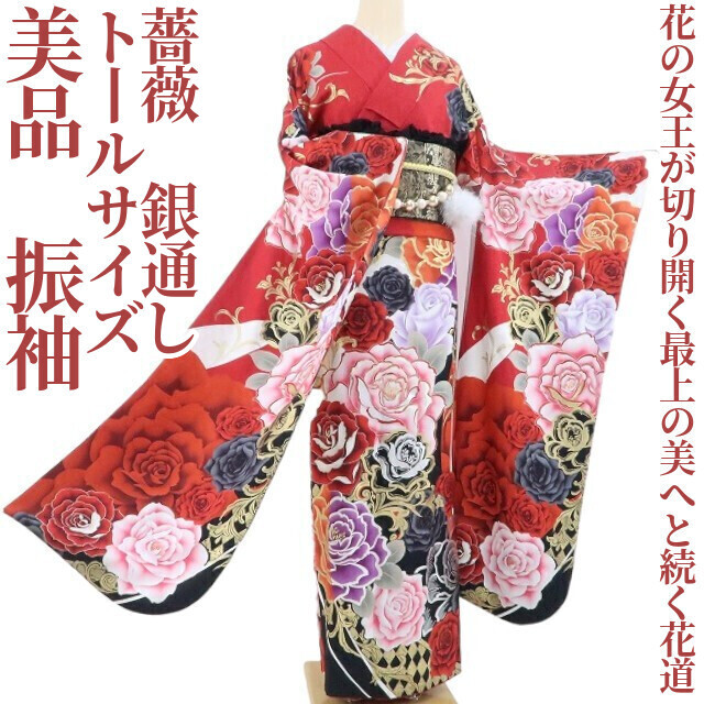 - tomihisa 美品 薔薇 銀通し 着物 成人式 正絹 トールサイズ“花の女王が切り開く最上の美へと続く花道”振袖 4042