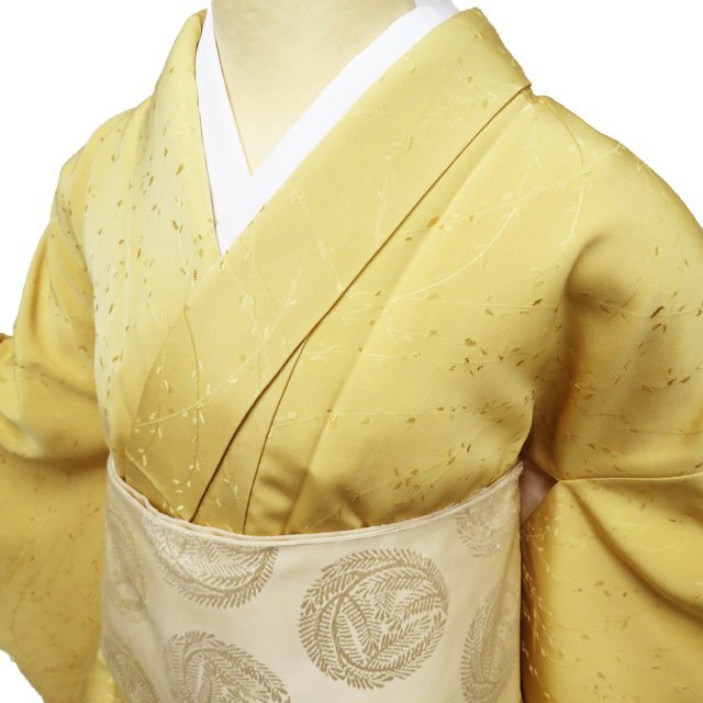 > 色無地 着物 中古 正絹 袷 フォーマル 紋付き 地模様 植物文様 麦藁色 身丈162cm 裄65cm M きもの北條 A1074-4