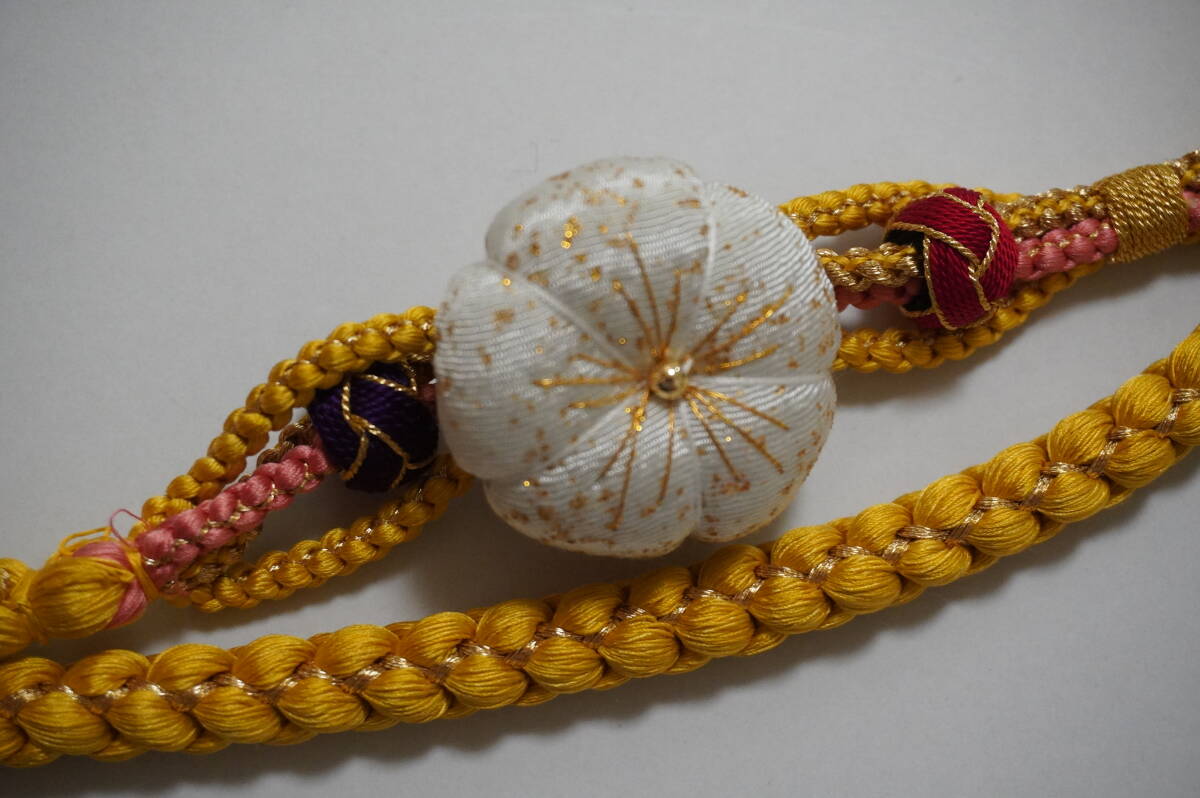 - 新品即決! 振袖用の飾りつき丸帯締め083(即決)浴衣着用時や髪飾りにも M表示 黄色系 ちりめん地で45mmの花