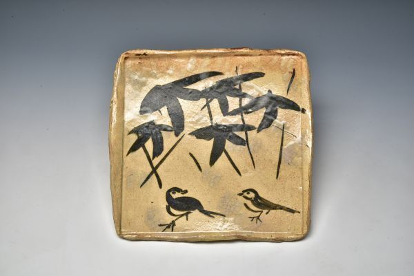 - 本物保証 魯山人 鉄絵 雪村 笹鳥 角皿 保存箱 本物返品OK 240911−2