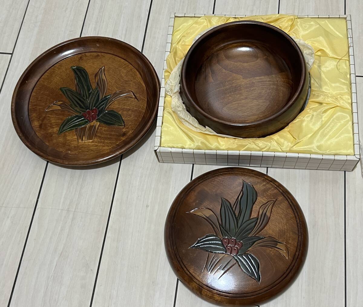 - 盆付菓子器 おもと彫 親子盆 木製皿 工芸品菓子皿 丸皿 木製漆器 菓子鉢 箱付き