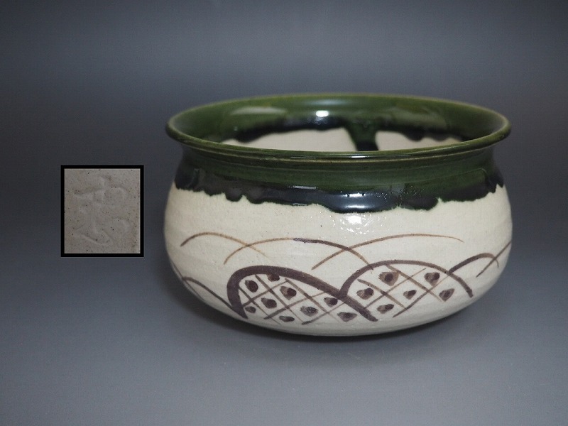 - A3031 織部焼 加藤忠 作 建水 ☆ 茶道具 茶器 抹茶道具 茶懐石 茶事 こぼし 水覆 水翻 水下 納汚 陶器 作家物 在銘 陶印 美品 良品 無傷
