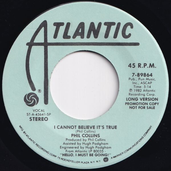 > Phil Collins I Cannot Believe It's True Atlantic US 7-89864 207358 ROCK POP ロック ポップ レコード 7インチ 45