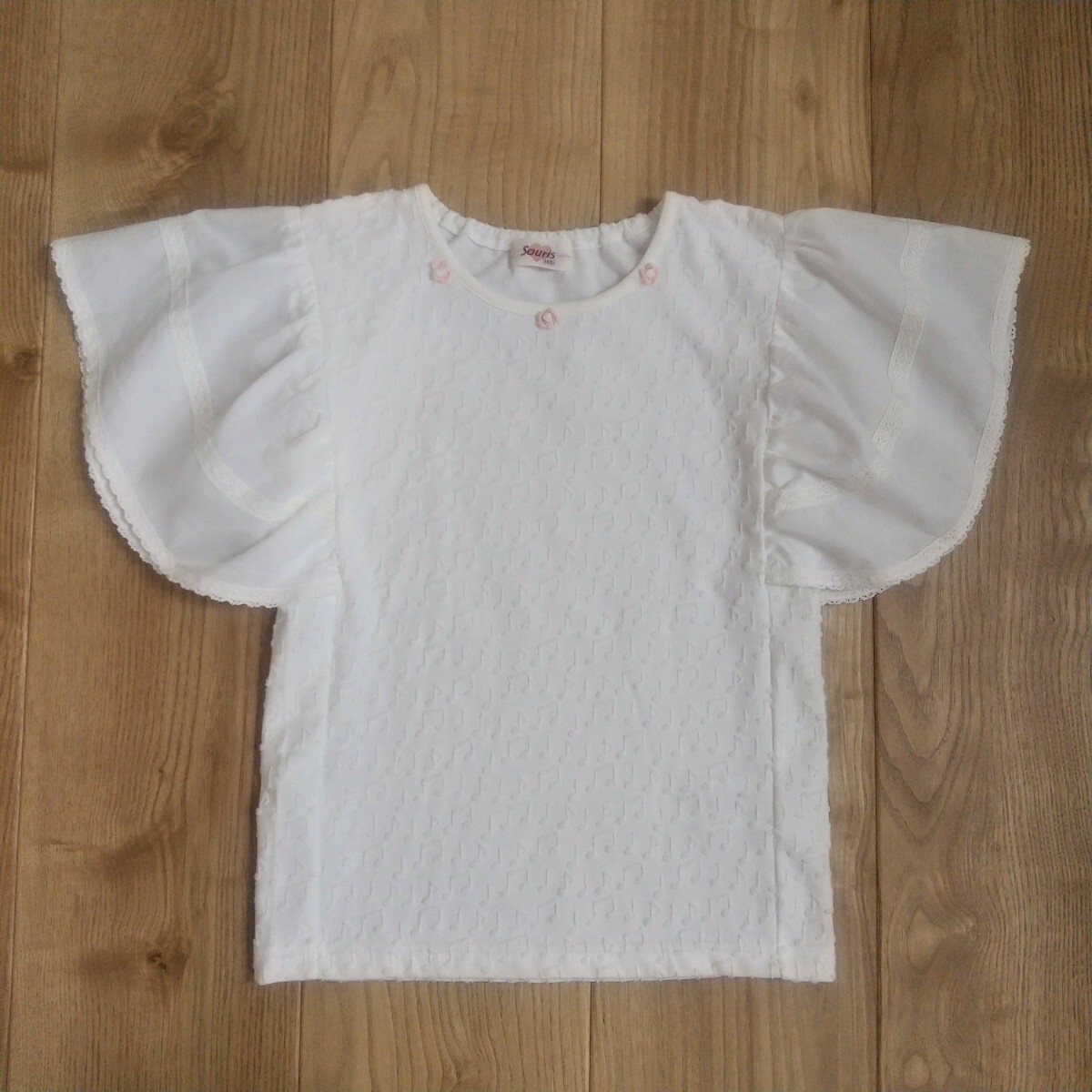 > 《試着のみ美品》 Souris スーリー ★ 音符柄 パイルジャガード フリルショルダー カットソー 【140】 (130~) * 女の子 白 半袖 Tシャツ