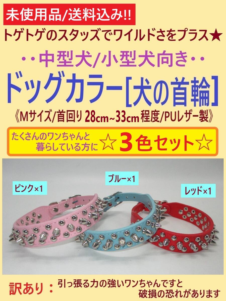 > 訳あり 未使用 犬 首輪 Mサイズ 3色セット A ブルー ピンク レッド スタッズ スパイク 首回り28-33cm 中型 小型 カラー PUレザー 海外製