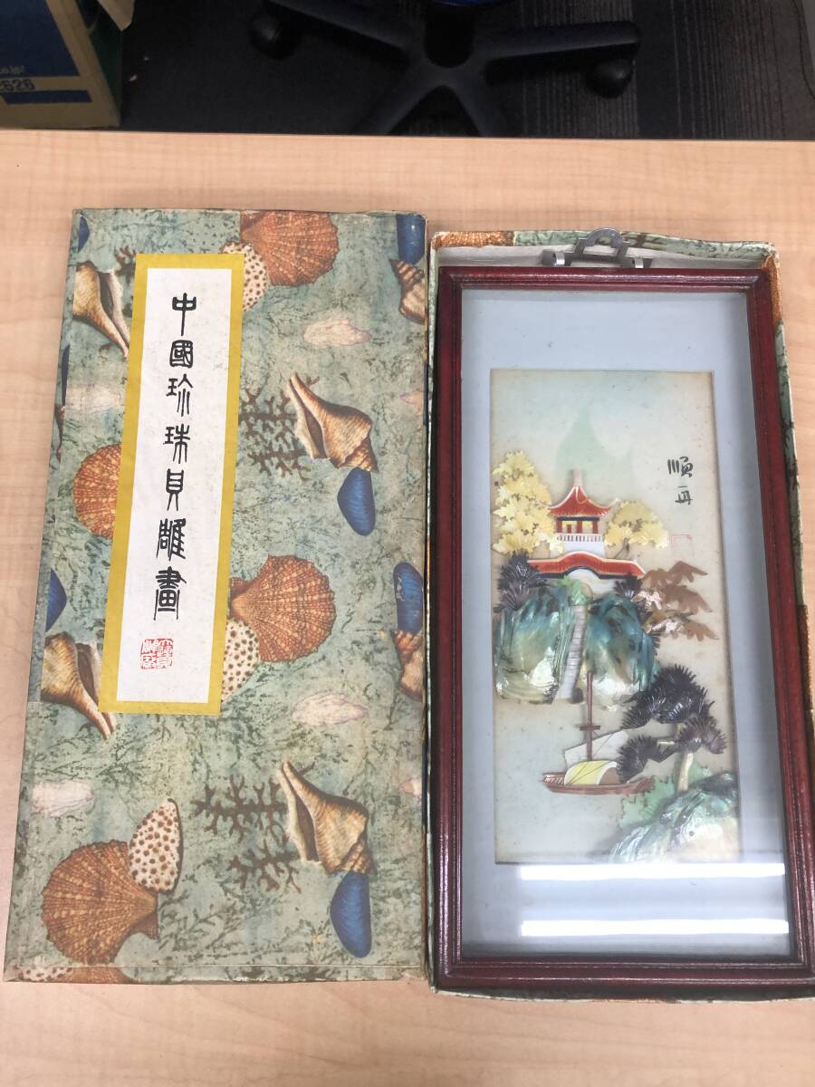- 中国珍瑞貝離書 額装 在銘 貝細工 シェルアート 飾額 中古品