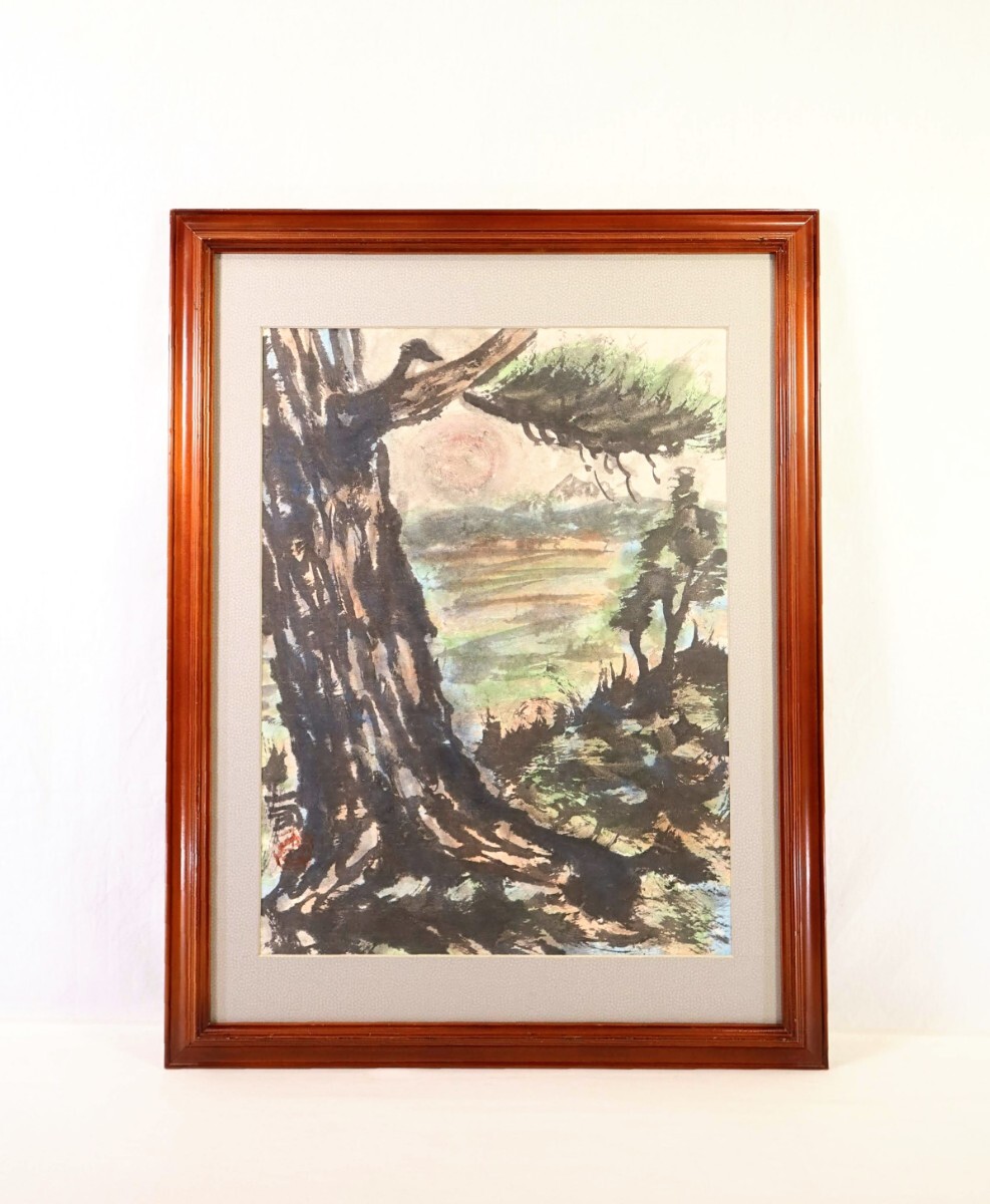 - 真作 赤羽根一司 墨彩「平野風景」画寸 45cm×60cm 長野県出身 日本画府理事 仏画壇でも活躍 力強い筆致の大樹の松と淡い色調の田畑 9585