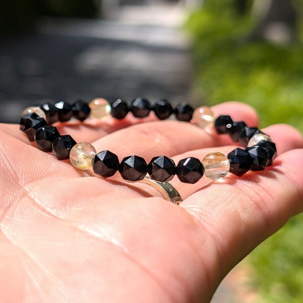 > ゴールド ルチルクォーツ スターカット ブラックスピネル ブレスレット きらきら輝く パワーストーン 6ミリ 数珠 お守り効果 ギフト お揃い