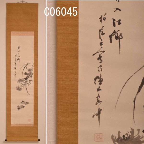 - C06045 柏陰居士画水墨法黄菊紫蟹図 掛軸:真作