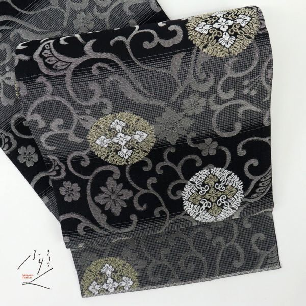 - 【針子】袋帯 フォーマル 煌びやか 特選品 モノトーン 横段 八藤に花唐草模様 黒地 正絹 着物 FB7-3