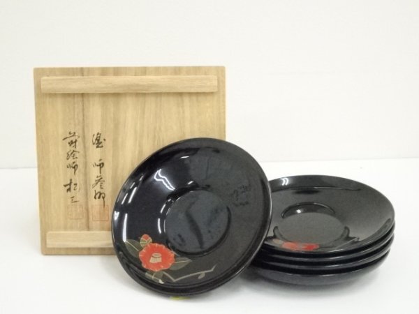 - ys7080347; 宗sou 輪島塗 塗師参州・蒔絵師松三造 椿蒔絵茶托5客(共箱)【道】