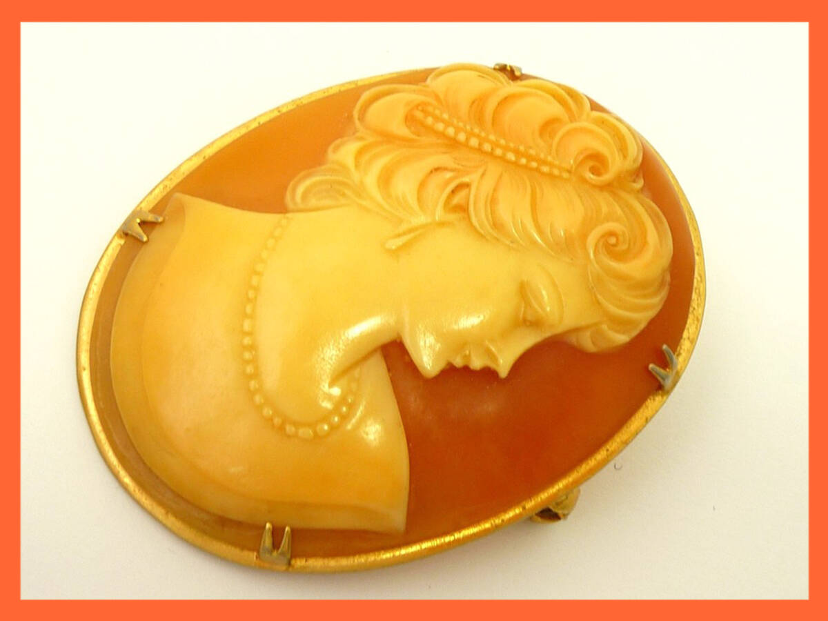 - 旧家蔵出 カメオ ブローチ 女神 ペンダントトップ アンティーク調 貴婦人 貴族 オレンジ ゴールド ヴィンテージ 素材不明 豪華 レア お買得