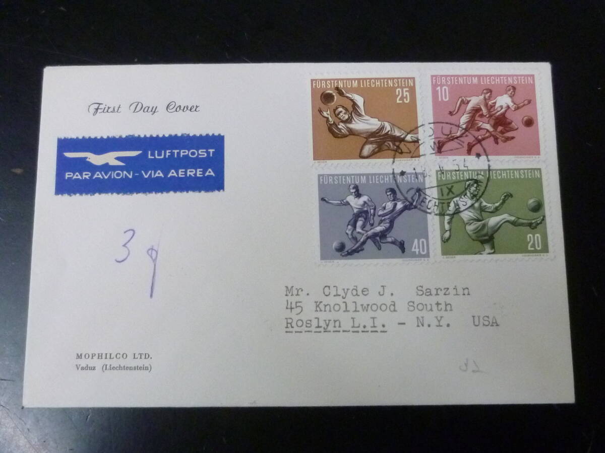 - 24L A №32 リヒテンシュタイン切手カバー 1954年 SC#277-80 サッカー 4種完貼 2印付 米国宛 ※説明欄必読