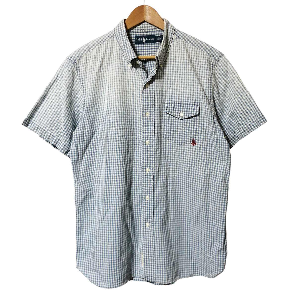> Ralph Lauren ラルフローレン チェック ボタンダウン シャツ 半袖 XL 白 青 刺繍 メンズ A28