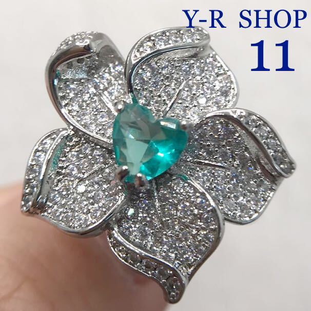 - 11号★パライバトルマリン風カラーストーンとホワイトトパーズのお花デザインゴージャスリング★レディース指輪シルバーアクセサリー新品