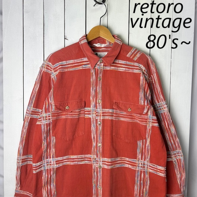 > sh●818 レトロ古着 80s~90s 編み込み柄 ヘビーコットンシャツ L~XL 薄赤 日本製 オールド ヴィンテージ エスニック 秋冬春 厚手
