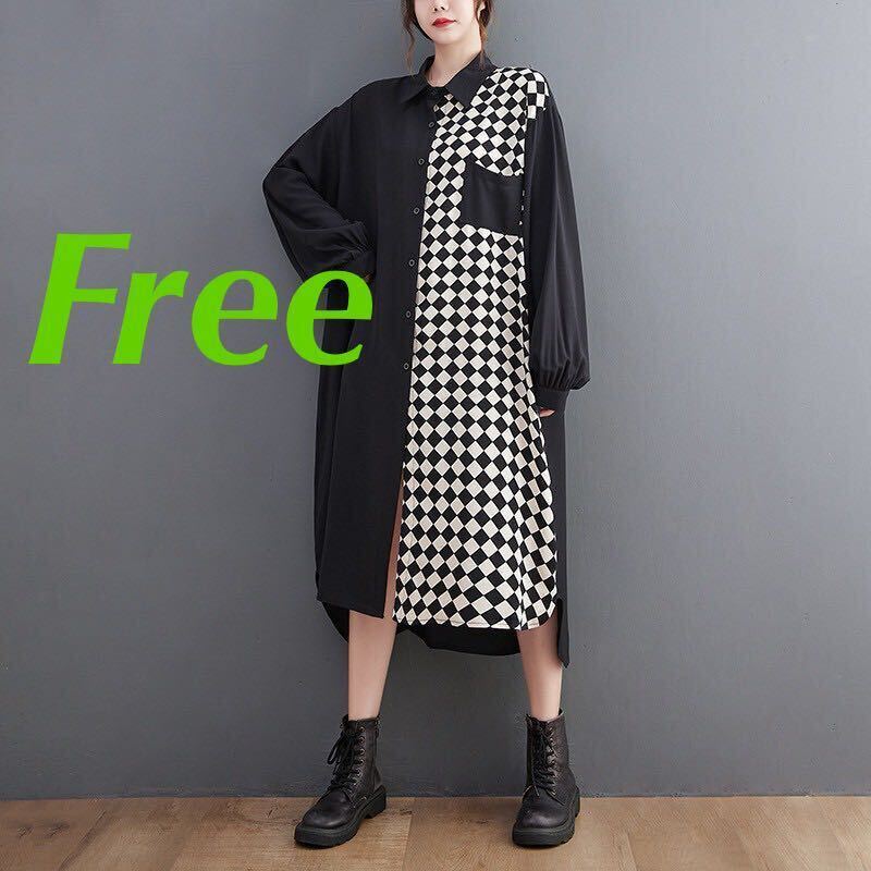 > ワンピース ロングワンピース ツートン ドレス シャツワンピース シャツワンピ チェック柄 モード 体型カバー 千鳥柄 トレンド 黒 F